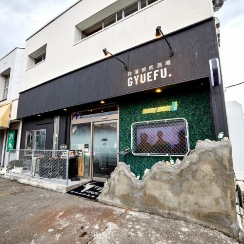 韓国の屋台を彷彿とさせる、ネオンとフェンスが特徴的なデザインです。入口には「韓国焼肉酒場 GYUEFU.」の大きな看板があり、開放的なガラスドアから活気のある店内を覗くことができます。道行く人が思わず立ち止まってしまうような、SNS映えするおしゃれな雰囲気です。
